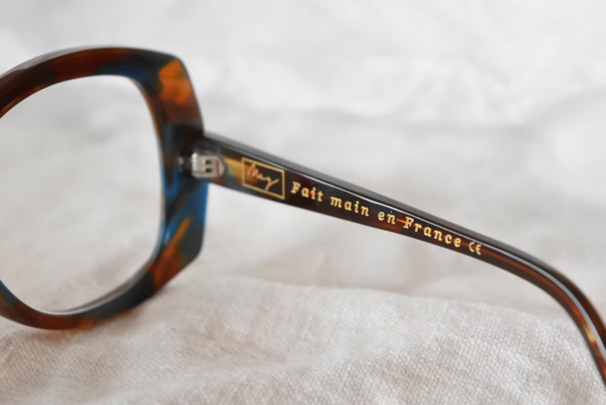 Mégane, attentive à la relocalisation des compétences artisanales, conçoit une collection entièrement fabriquée à la main à Oyonnax. Les designs féminins et les couleurs sobres mais élégantes prennent vie grâce à l'utilisation d'acétate de cellulose, une matière dérivée de la fleur de coton.